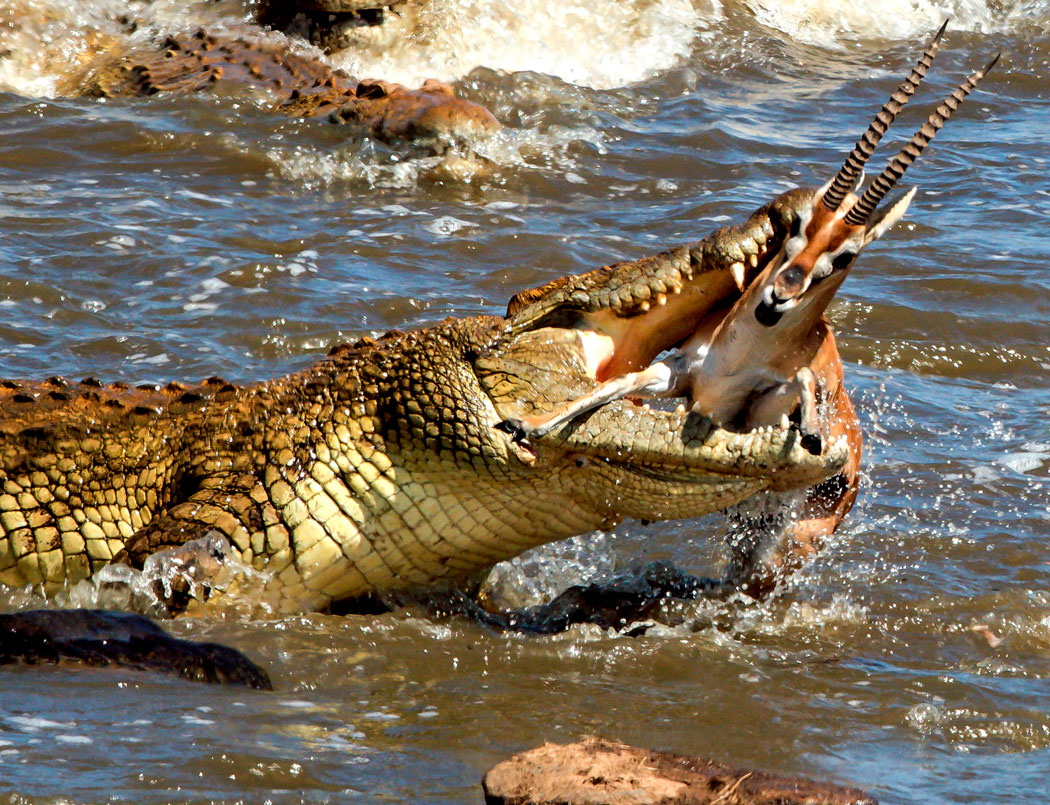Если добыча оказывается в пределах досягаемости, крокодил мгновенно нападает, сомкнув свои челюсти. Они могут не убивать свою жертву, а пытаться отрывать от нее куски, вращая свое тело. За один раз крокодил способен проглотить кусок своей жертвы, равный половине массы своего тела.