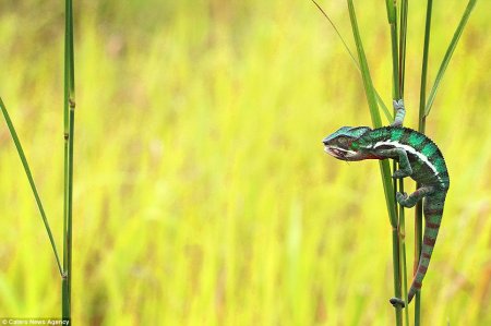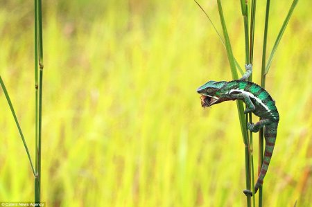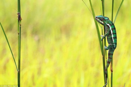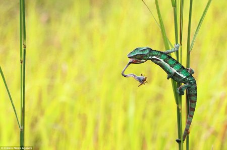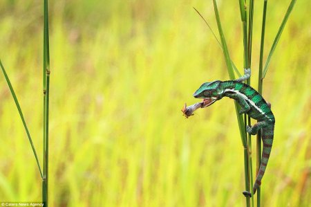 В животном мире время обеда наступает, когда «блюдо» оказывается на вытянутой руке. Точнее, на вытянутой лапе. А в случае хамелеонов – на расстоянии их длинного языка. Благодаря высокоскоростному и точному языку, который в два раза длиннее их тела, хамелеоны могут захватывать «блюдо» с соседнего стебля травы. Это удачно удалось запечатлеть 39-летнему фотографу Шикхею Гоху из Индонезии.