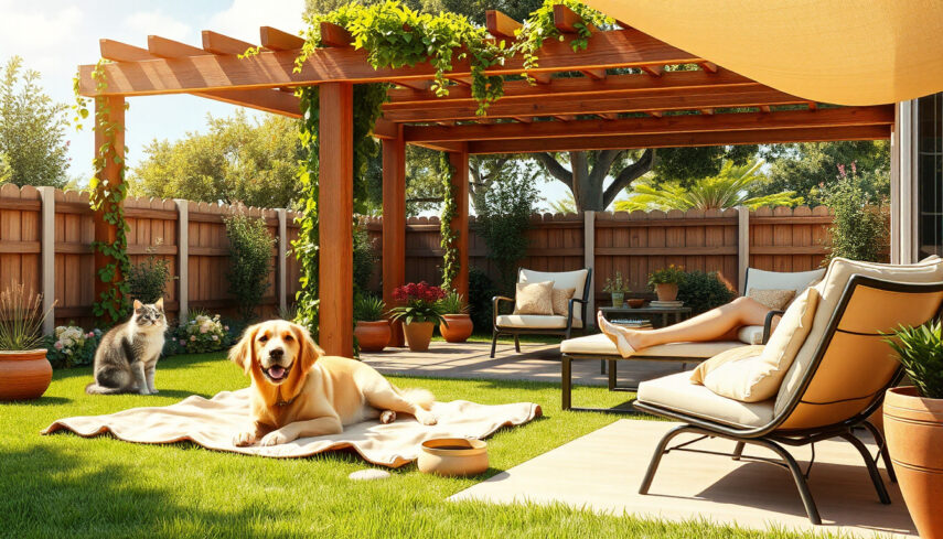 Еще один вариант — перголы. Это деревянные или металлические конструкции, которые можно украсить вьющимися растениями, например, виноградом или клематисом. Пергола не только даст тень, но и станет уютным уголком для вас и вашего питомца. А если бюджет позволяет, подумайте о зонтах или маркизах — они легко убираются, когда тень не нужна.