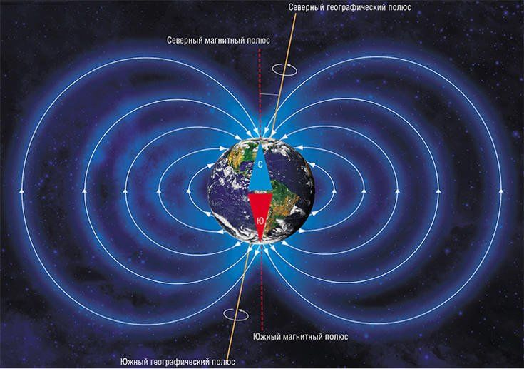 Условно Землю можно представить как огромный намагниченный шар. В каждой точке поверхности планеты присутствует магнитное поле, направление которого легко определить с помощью стрелки компаса, всегда ориентированной на магнитный полюс. Напомним, что магнитные полюса находятся в некотором отдалении от географических полюсов, через которые проходит ось вращения Земли.