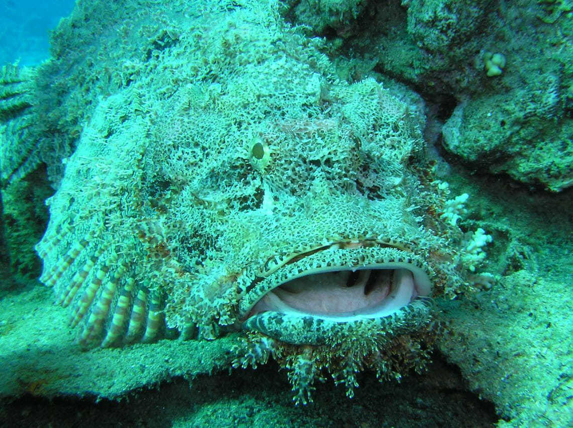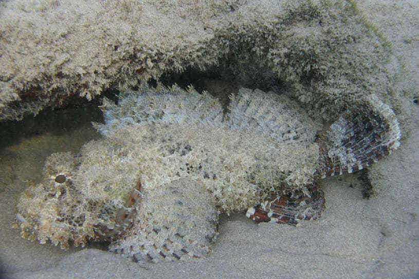 Скорпенопс (бородавчатка) – почти невозможно заметить на дне, так как он сливается с ним по цвету, а на его теле находятся опасные ядовитые шипы, которые вызывают сильную боль, отек и опухоль, могут парализовать дыхание и привести к летальному исходу.