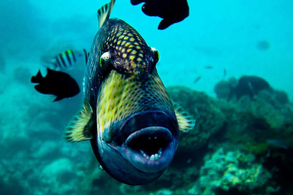 Балистод синеперый (рыба триггер) – истинный воин и защитник своей территории, атакующий с помощью зубов длиной 7 сантиметров.