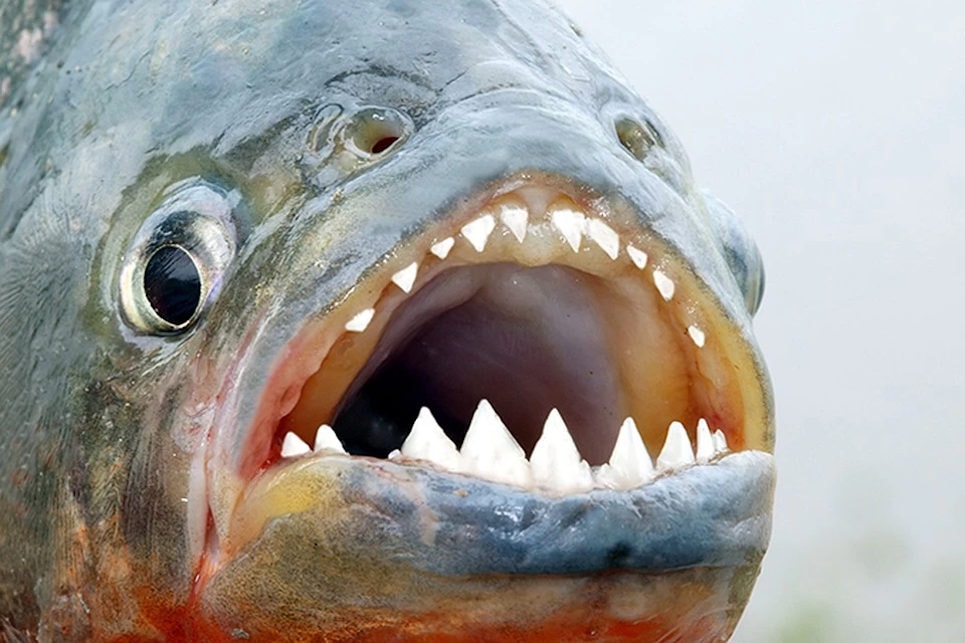 Несмотря на классификацию, зубы пираний напоминают не пилу, а скорее бритву или остро наточенные ножницы. Они имеют треугольную форму (верхний треугольник входит в паз между нижними) и достигают 4-5 мм в длину. Эти зубы не просто метафора «острые, как бритва»: в древности индейцы действительно использовали их в качестве бритв.