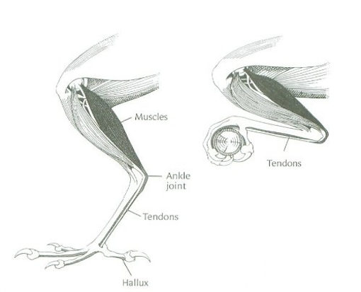 Мышцы ног соединены с пальцами специальными сухожилиями. При посадке на ветку происходит сокращение мускулатуры ног, что приводит к натяжению сухожилий. В результате пальцы лап сгибаются. Пока птица не перенесет свой вес с лап на крылья, пальцы не могут разогнуться естественным образом.