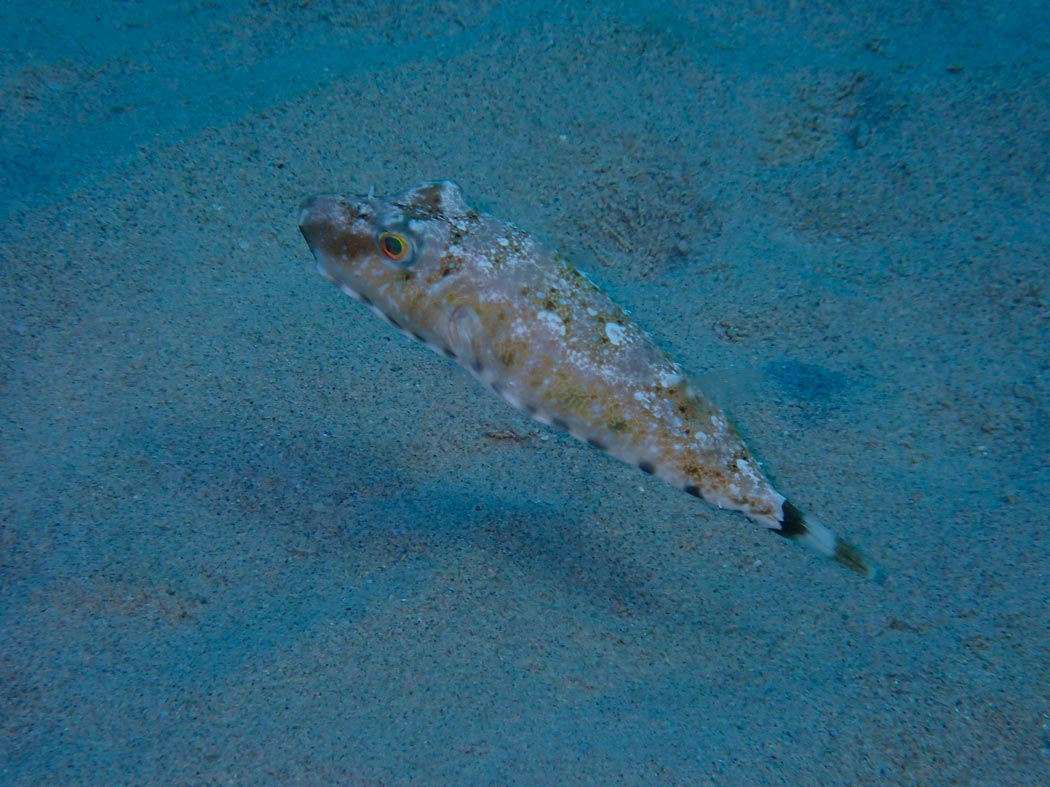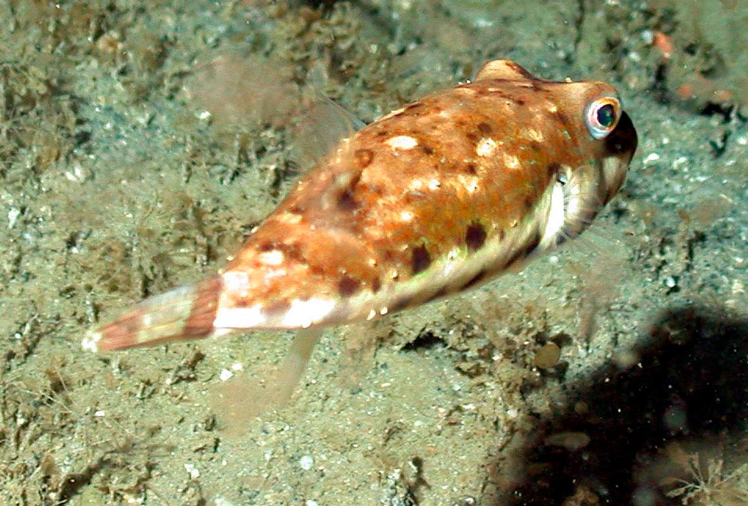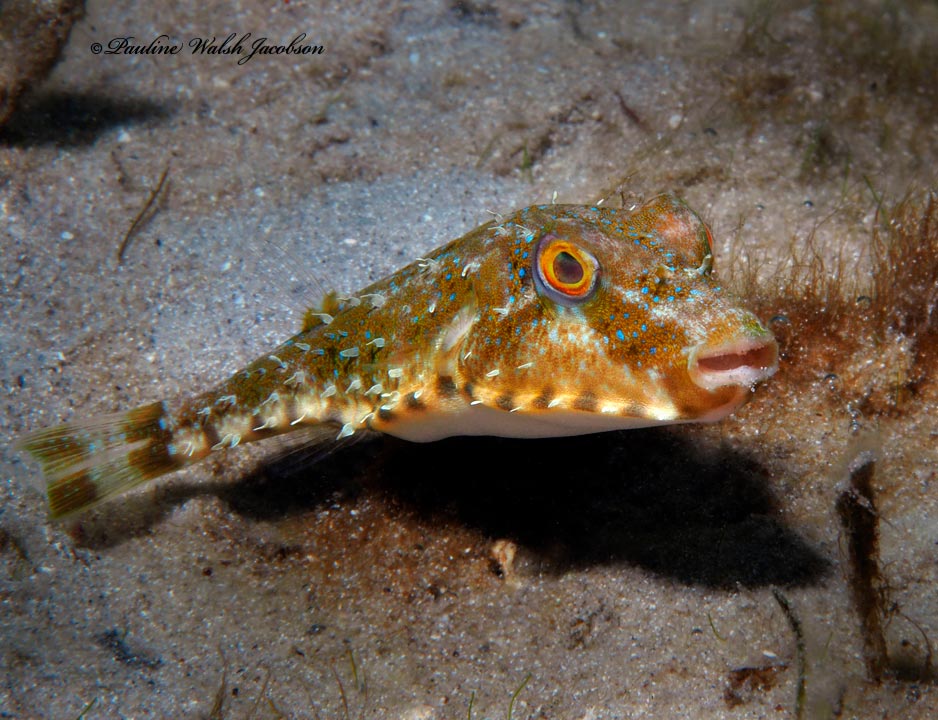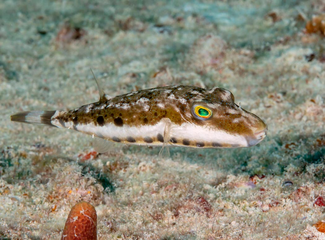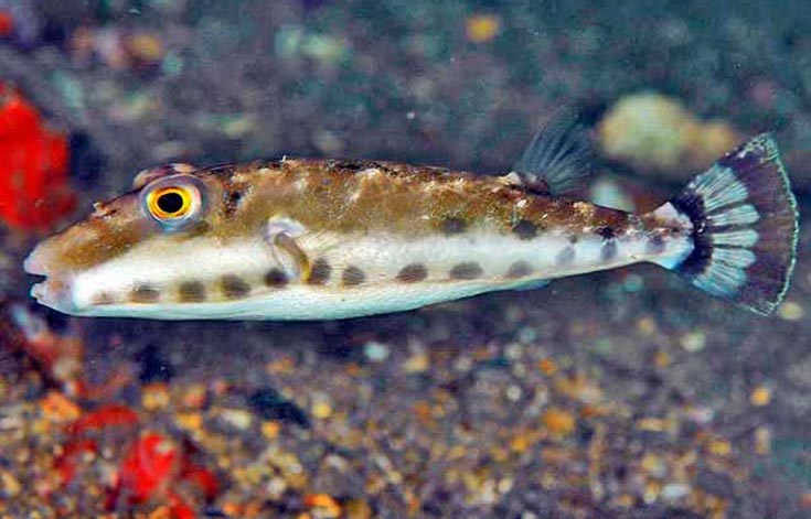 Достигает длины около 7 сантиметров, что делает его самым маленьким представителем своего вида. Эти рыбы из семейства иглобрюхих отличаются яркой окраской. Кроме того, их цвет прекрасно адаптируется к различным условиям обитания. Если рыба погружается на глубину, ее окрас темнеет. Самки имеют более приглушенные оттенки, что позволяет отличить их от самцов, у которых более привлекательная окраска с тонкими полосками.