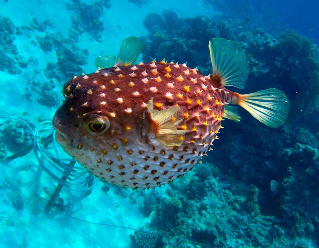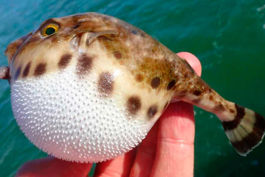 Тело этой рыбы покрыто не мелкой чешуей, а маленькими шипами. В случае опасности эти шипы служат дополнительной защитой, когда рыба надувается, не позволяя хищнику проглотить иглобрюха.