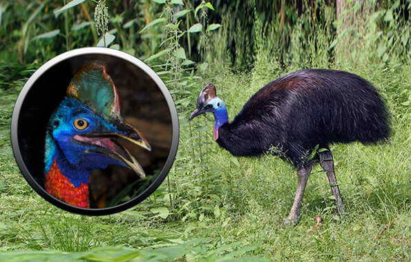 Казуар – это вторая по величине птица в мире, которая обитает в лесах Новой Гвинеи и в северо-восточной части Австралии. Рост самых крупных особей достигает 2 м, а вес – 60 кг. У казуаров оригинальный внешний вид: массивное тело с густым оперением, маленькие и незаметные под длинными перьями крылья, мощные ноги, длинная шея с свисающими выростами, синяя лысая голова и роговой шлем на макушке.