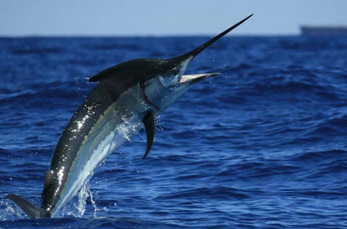Третье место в рейтинге занимает рыба черный марлин. Исследования, проведенные учеными ВВС, показали, что марлин способен развивать скорость до 85 километров в час. Эта информация основана на рыбе, пойманной на сверхпрочную леску. Рыба получила свое название не случайно. Марлин очень похож на свайку (металлический стержень с заостренным концом).