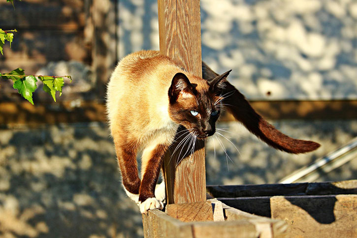 Не следует отпускать сиамских кошек одних на улицу; лучше выгуливайте их на шлейке в парках, где они с удовольствием будут исследовать кусты и ловить бабочек в траве.