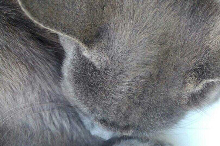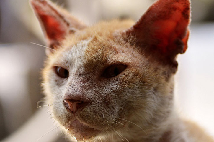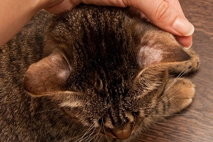 Сначала кожа кота покрывается красноватой сыпью, которая лучше всего заметна на морде возле ушей, где шерсть самая короткая. При этом кот становится беспокойным и раздражительным из-за постоянного зуда, он часто чешется и может расчесать кожу до крови. Затем сыпь трансформируется в участки с более редкой шерстью – волосы в этих местах обломаны.