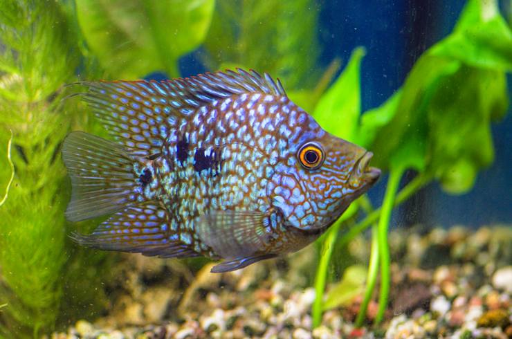Это хищная рыба с агрессивным характером, известная своими яркими голубыми и зелеными пятнами на теле. За бойцовский нрав ее называют «Джек Демпси» в честь популярного боксера. Рыбки вырастают до 25 см и предпочитают жить в аквариумах от 100 литров, часто перекапывая грунт.